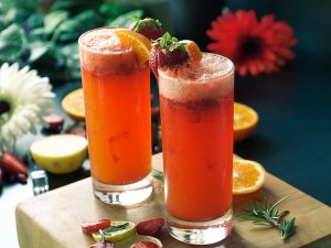 In a serving glass,add crushed ice,pureed strawberry (2-3 tbs),crushed strawberries (2-3 tbs),orange juice (1/4 Cup),7up & garnish with orange,strawberry & serve!