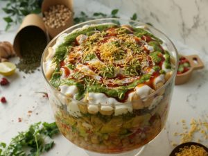 -In a deep serving bowl,add boiled chickpeas,chaat masala,red chilli crushed,prepared hari chutney, mixed vegetable salad,boiled potatoes,prepared meethi chutney,peanuts,sev nimco,prepared yogurt meethi chutney,hari chutney,papri,boiled whole green gram,chaat masala,dahi phulkiyan, yogurt,meethi chutney,hari chutney,red chilli crushed,sev nimco & serve!