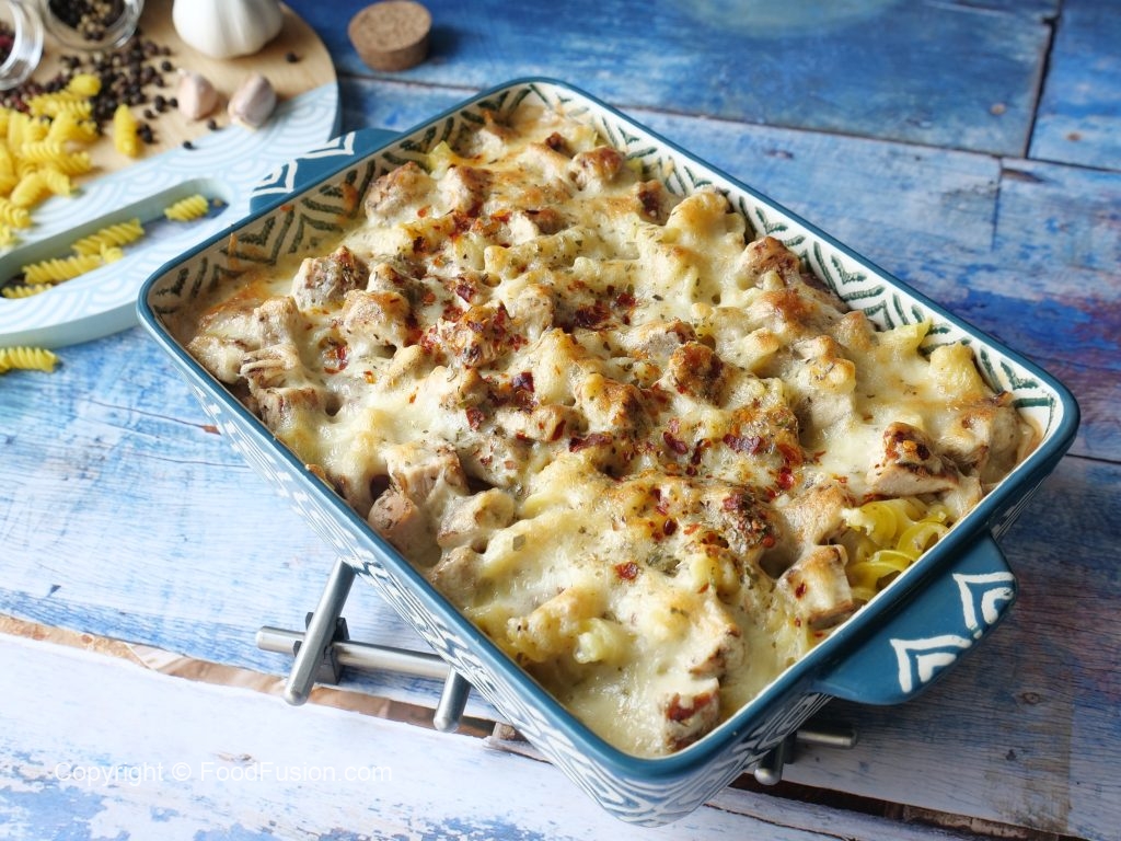 Baking dish ko oil sa grease karein,boiled spiral pasta,alfredo sauce aur chicken cubes dal ker mix ker slightly stir ker lein.