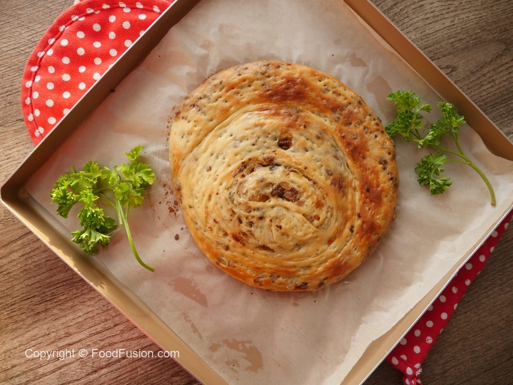 In frying pan,place afghani fateer qeema,press gently and prick with fork and brush milk,cover and cook on very low flame for 10-12 minutes then flip and apply melted butter and cook from both sides until done.