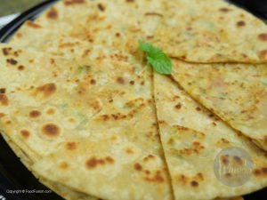 Heat griddle and place rolled paratha on it, fry from both sides with ghee.