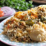 Add boiled rice,sprinkle orange food color,add fried onion,fresh coriander,mint leaves,green chilli, lemon slices and ghee,cover with kitchen cloth & lid,simmer on low flame for 15-20 minutes.