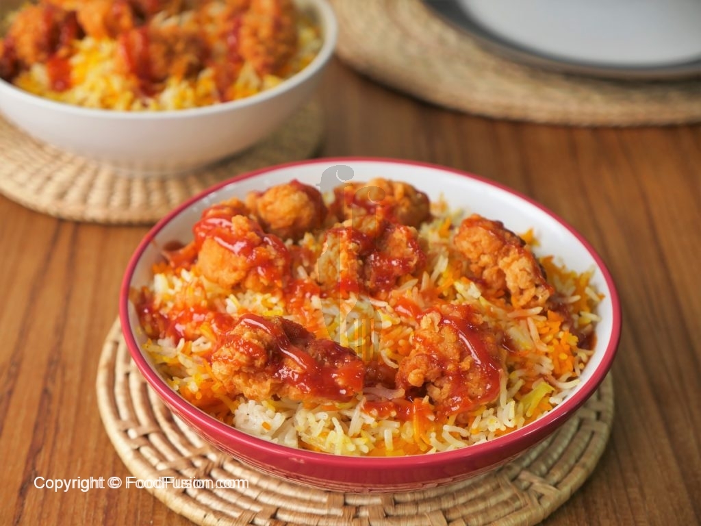 In serving dish,add cooked rice,fried chicken shots and drizzle red sauce.