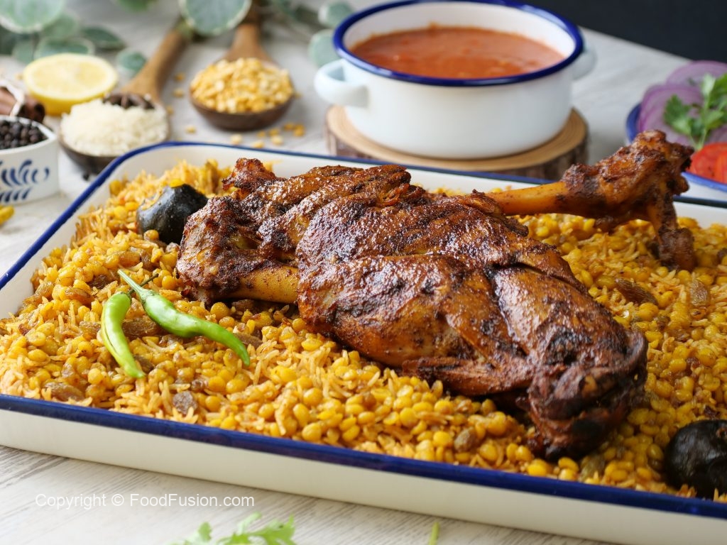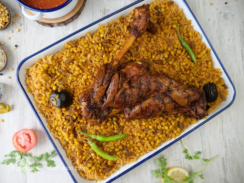 -On a serving platter,add & spread prepared rice,daal & raisins,mutton leg & garnish with green chillies & serve!