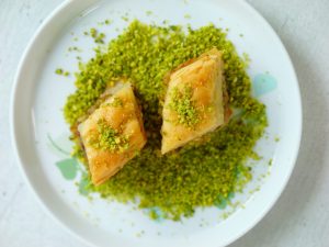 -Cut into diamond or square shapes of bakhlava using a sharp knife & separate the side of pan.