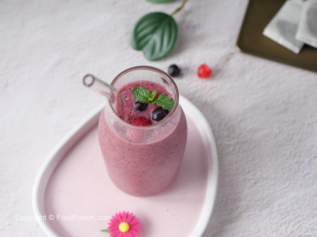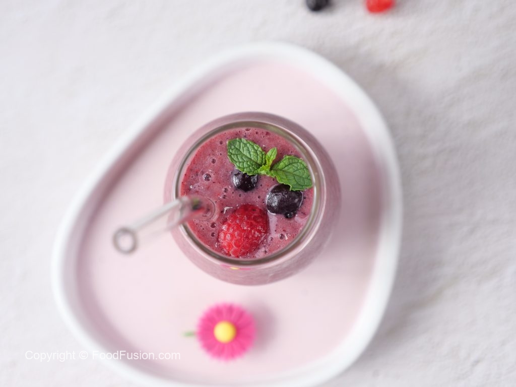 -In serving glass,add prepared smoothie & garnish with frozen berries,mint leaves & serve!