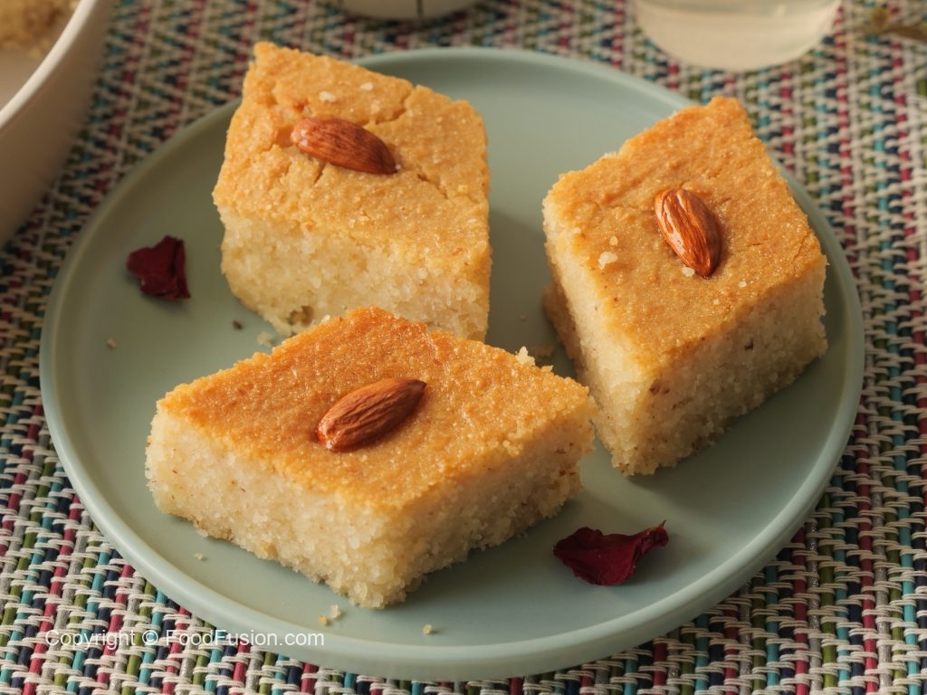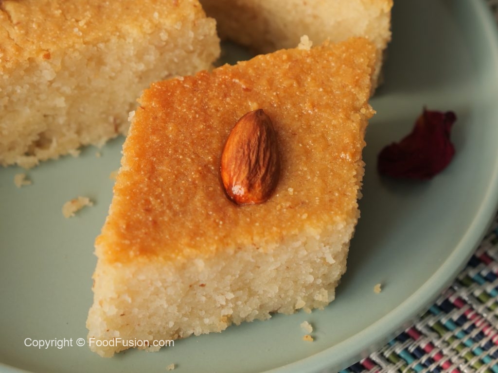 Prepare Basbousa cake with semolina & almonds: