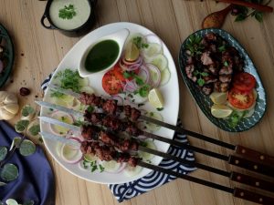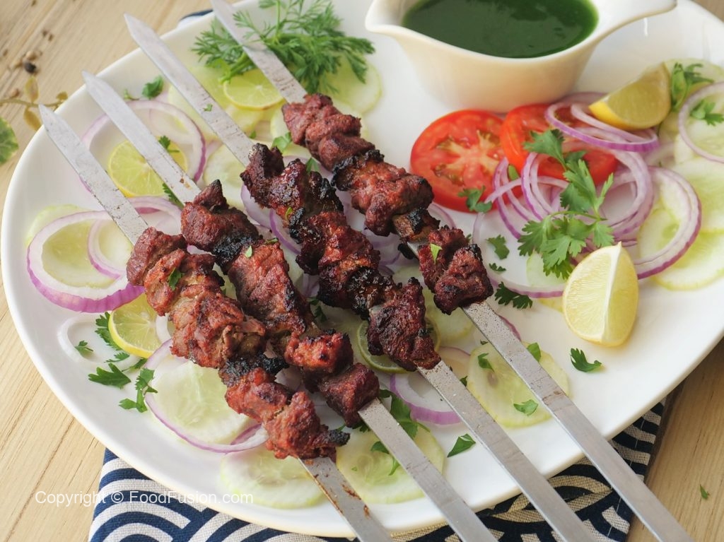 Serve Beef afghani boti with salad, raita & green chilli sauce.
