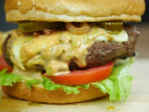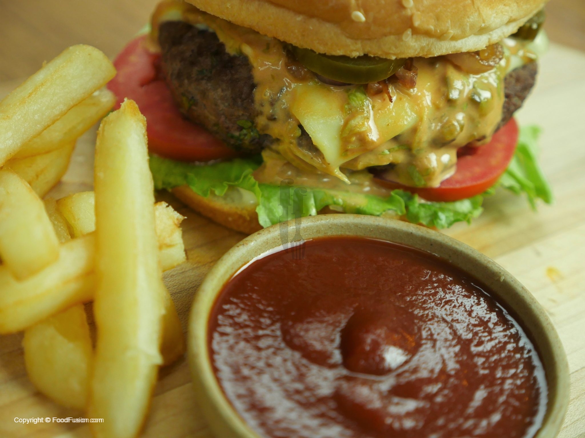 In assembling you can add any vegetable of your choice and assemble burger any ways you like. How we did is: On bun spread mayonnaise, ice burg lettuce leaf, tomato slices, beef patty with cheese, fusion sauce, caramelized onion or raw onion slices, jalapenos slices and top bun.
