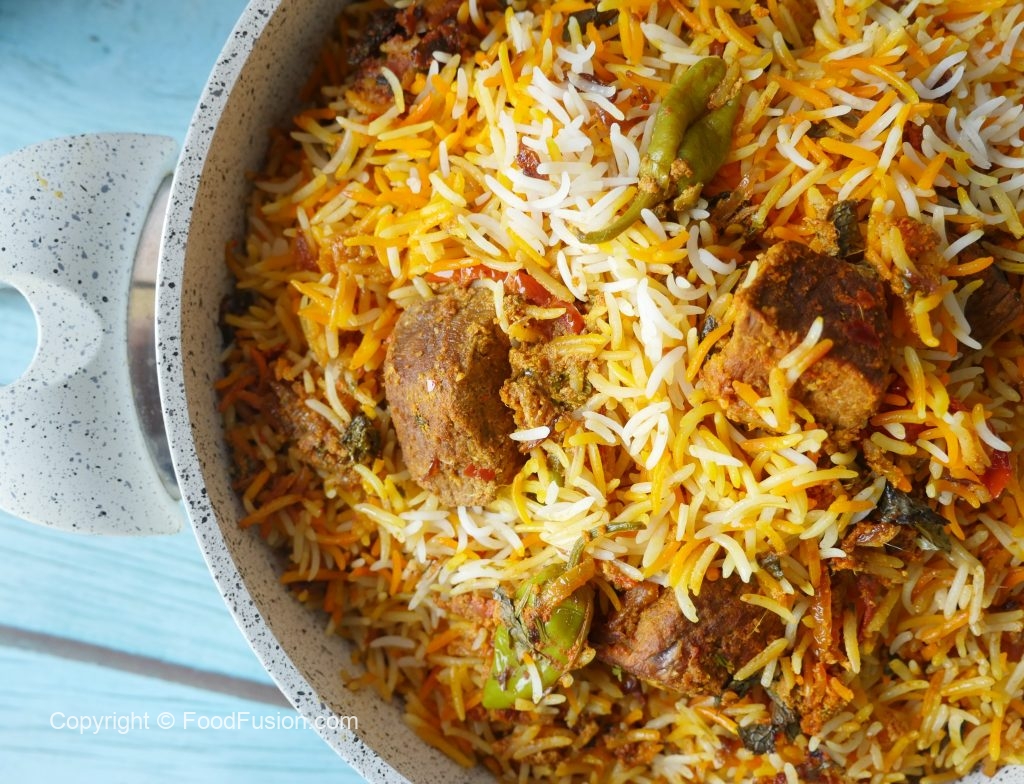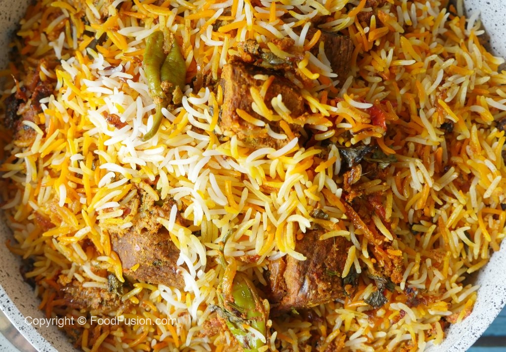 Add & spread half quantity of boiled rice,reserved gravy,steam cooked beef pieces,fresh coriander, mint leaves,fried onion and remaining quantity of boiled rice.