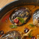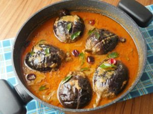 Take egg plants,make 4 small cuts in the eggplant but don’t separate them and keep them intact, including the stem,sprinkle salt and stuffed with ground spice mixture & set aside.