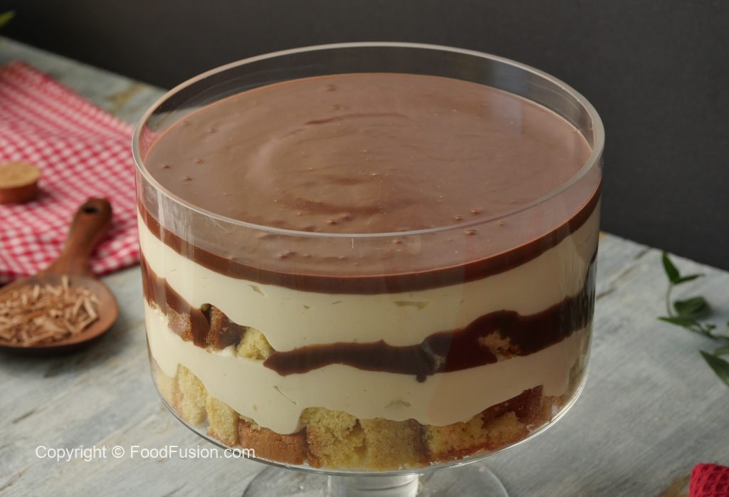 -Serving dish may sponge ki layer, prepared boston cream, spong cake, prepared chocolate ganache, prepared boston cream daal den. Ab upar se chocolate ganache daldein aur thanda ho janay tak refrigerate ker lein.