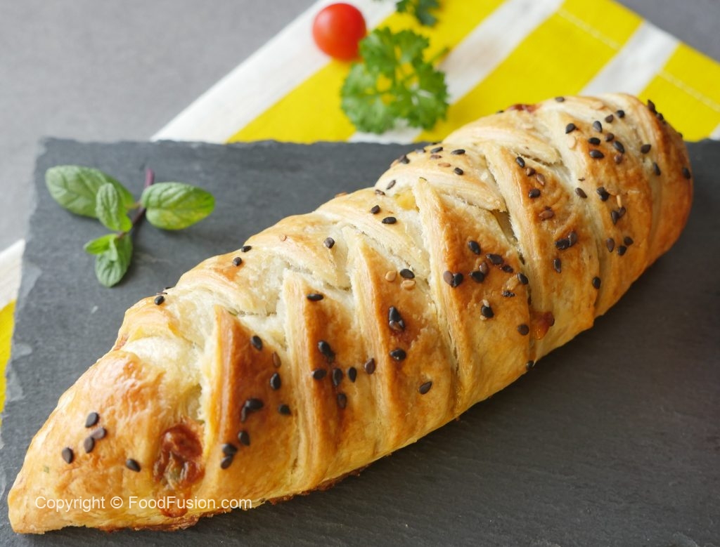 Braid ki tarhan overlap kertay hoye bread ka cuts ko alternately bundd kertay jayein (makes 4-5).