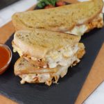 -On toasted sour bread slice,add melted chicken & cheese & top with another bread slice to make a sandwich (makes 4-5 sandwiches).
