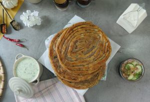 -Add & spread clarified butter,sprinkle garlic,prepared spice mix,fresh coriander,fold the paratha vertically from both sides & roll up.