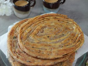 -Ghee dal ker pheela lein,lehsan,tayyar spice mix aur hara dhania dal ker paratha ko vertically fold ker ka roll ker lein.