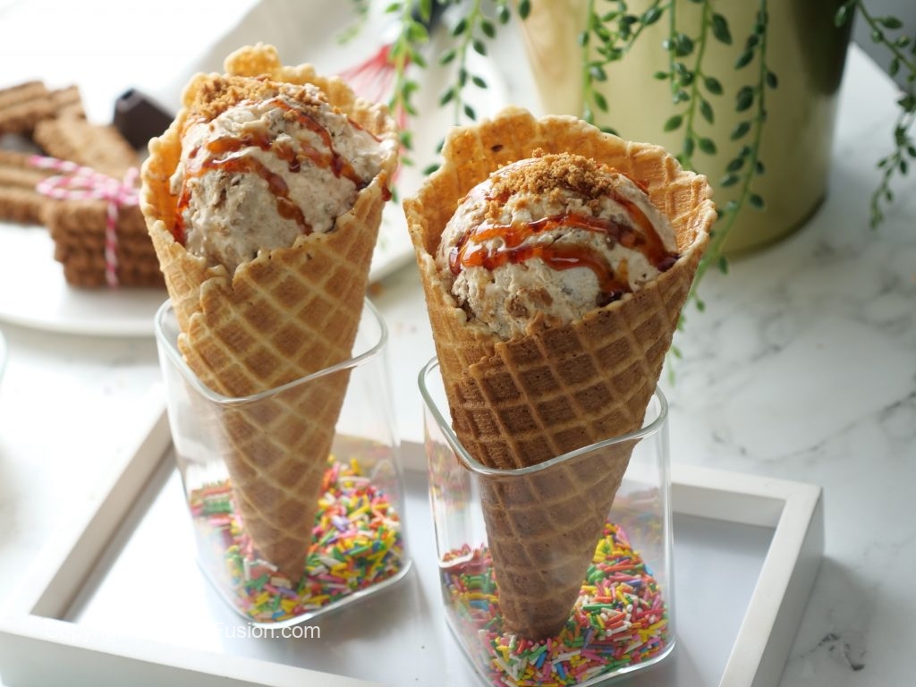 -Once frozen completely,scoop out,drizzle caramel syrup,add crumbled candi biscuits & serve!