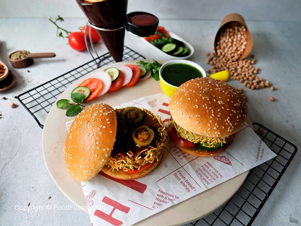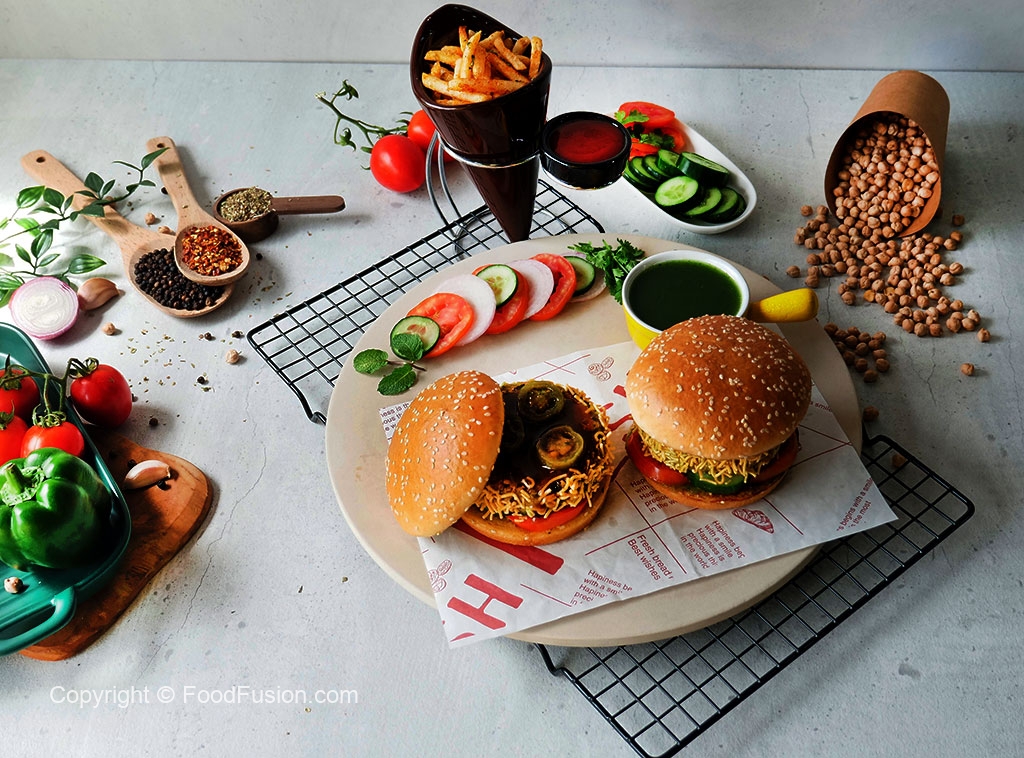 On a burger bun,add & spread green chilli sauce,add tomato,cucumber,fried patty,jalapeno slices & drizzle tamarind sauce.