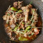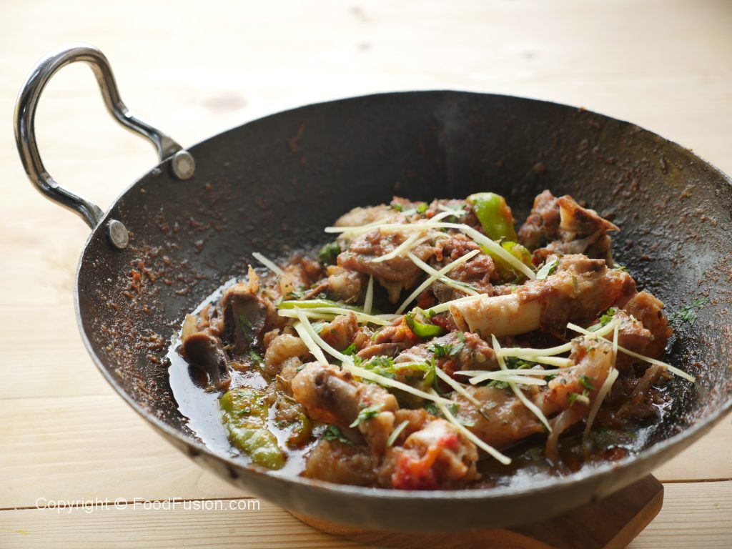 In wok,add mutton with bones,fat and salt.