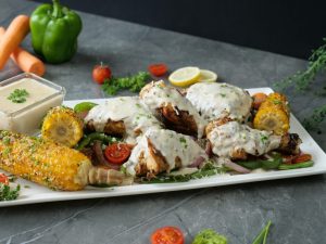 -Serving platter per grilled vegetables,chicken tikka pieces aur grilled corns rakh dein.