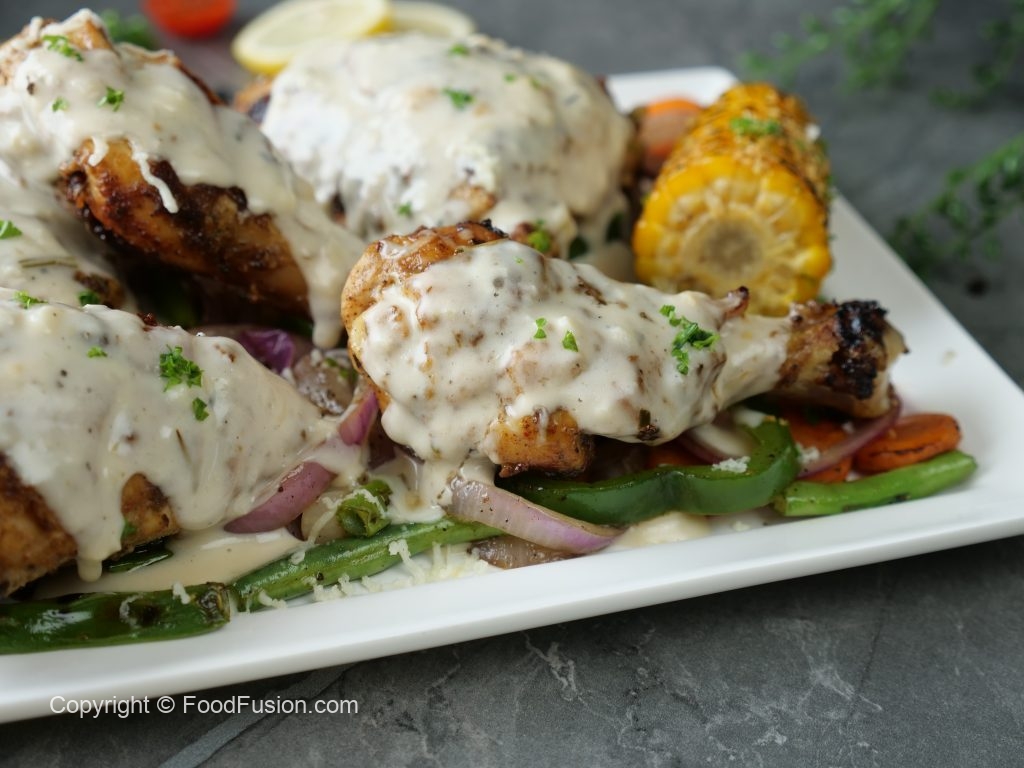 -Grate cheese with the help of grater & pour prepared garlicky cheese sauce on chicken tikka pieces,fresh herbs & serve!