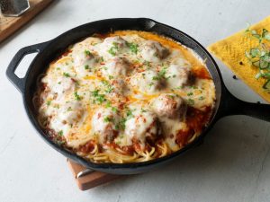 Add prepared meatballs with sauce,add cheddar cheese,mozzarella cheese & red chilli crushed,cover & cook on low flame until cheese melts (4-5 minutes).