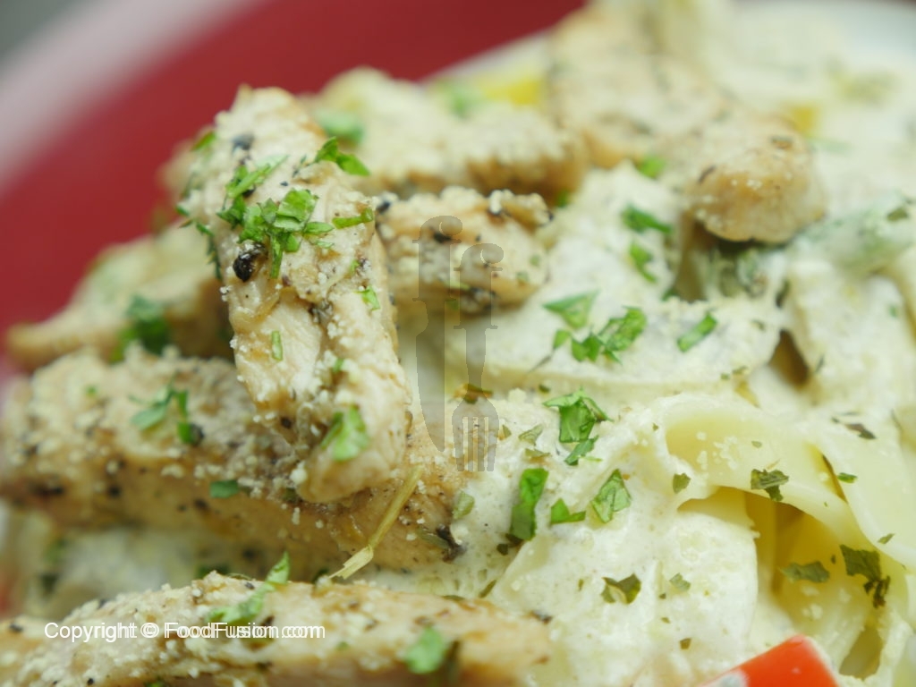 Plating ke liye pehle pasta set karein, phir sauce daalein, chicken daalein aur akhir main parmesan cheese aur parsley se garnish karein.