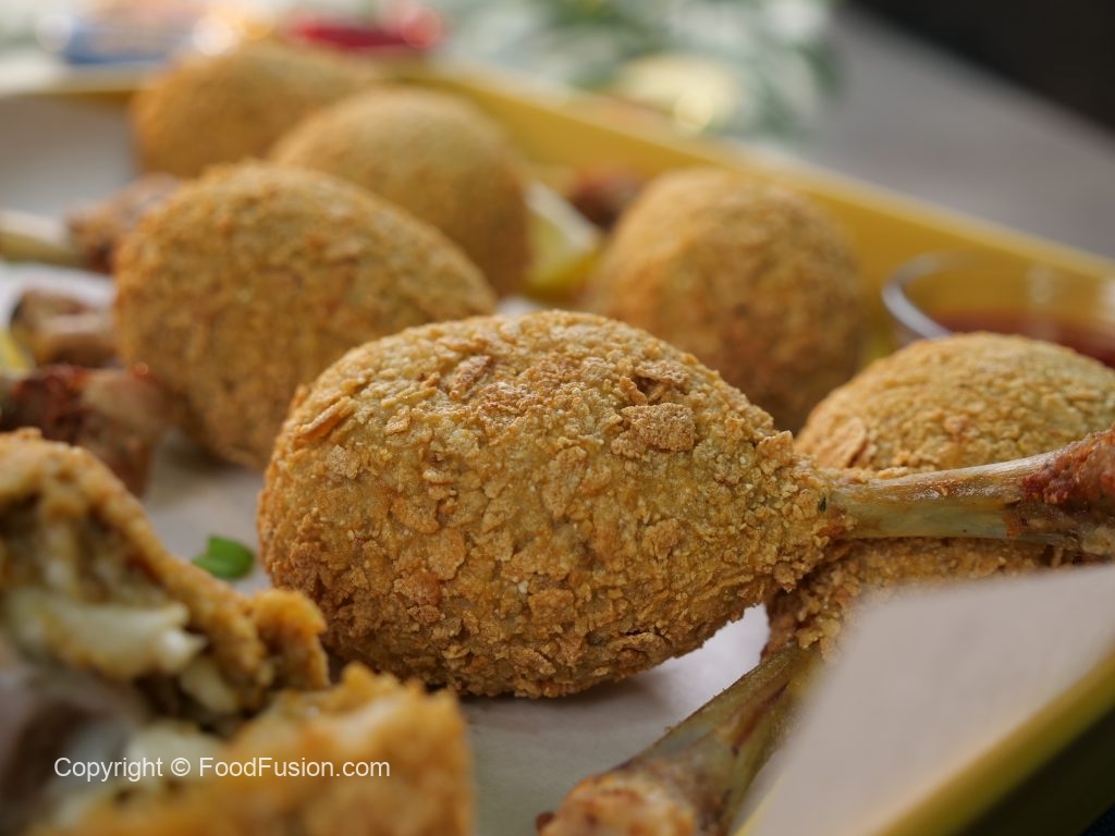 -Add cheese,insert reserved drumstick bone & press it to make a perfect shape of drumstick.