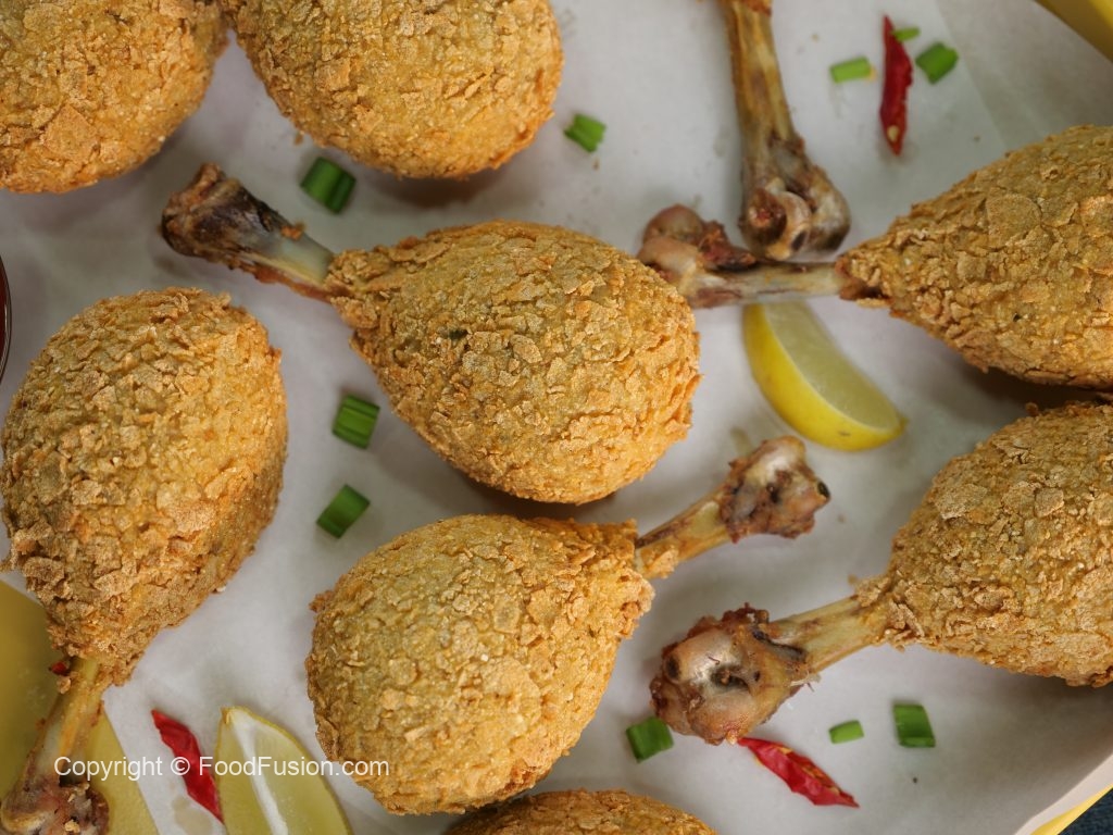 -Coat chicken drumsticks with all-purpose flour,dip in whisked eggs then coat with cornflakes.