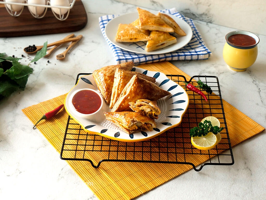 Lined baking tray with butter paper,place chicken curry puffs,apply egg yolk & bake in preheated oven at 180C for 25-30 minutes.