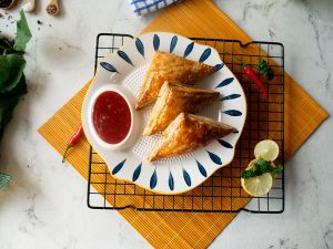 In air fryer machine,place butter paper and chicken curry puffs,apply egg yolk and air fry at 200 C for 8 minutes.