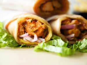 Paratha per tomato ketchup,pyaz soaked in lemon juice aur cooked chicken dal ker wrap ker lein & serve karein.