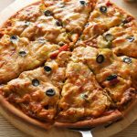 Pizza sauce dal ker pheela lein,cooked chicken filling,mozzarella cheese,cheddar cheese aur black olives dal dein (makes 2 regular pizzas).