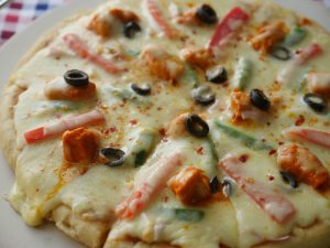 -Pizza sauce dal ker pheela lein,cooked chicken,pyaz,tamatar,pickled jalapenos,mozzarella cheese,cheddar cheese,dried oregano & lal mirch crushed dal dein (makes 6).
