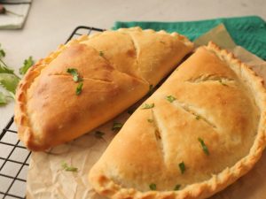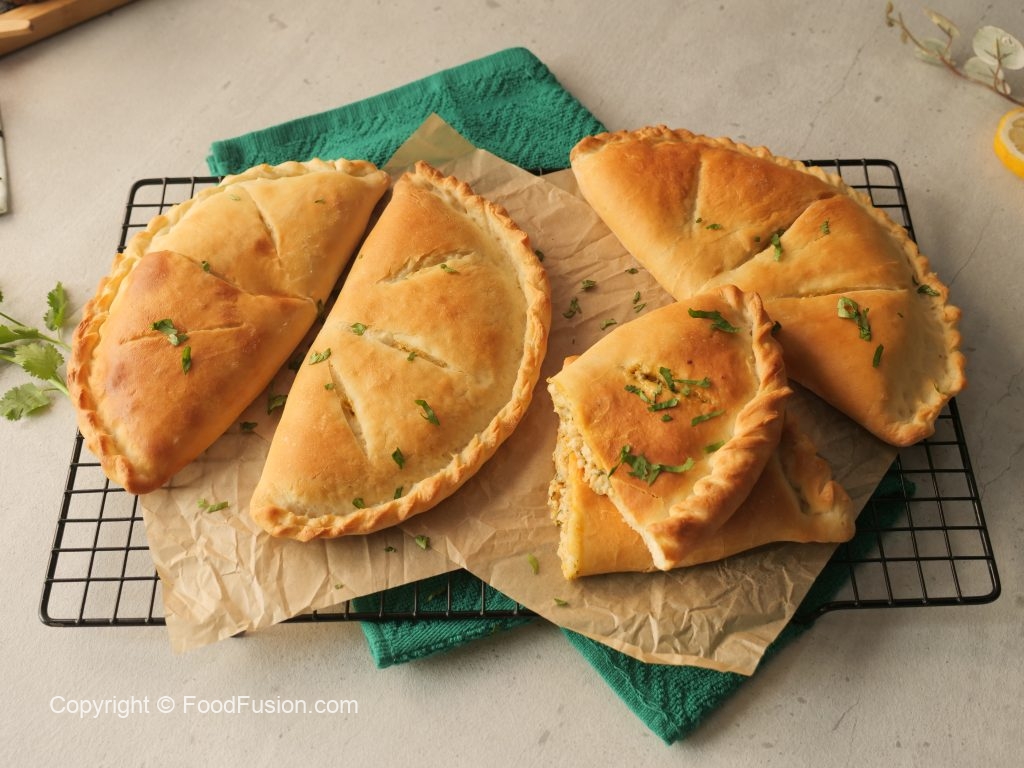 -On baking try (greased with cooking oil and lined with butter paper),place rolled dough,on half side of the dough,add chicken filling,apply water and fold the other side over it,press and apply water and seal the edges.