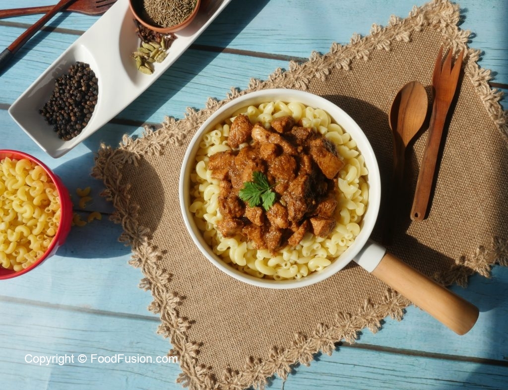 On serving plate,add boiled macaroni,korma masala & serve!