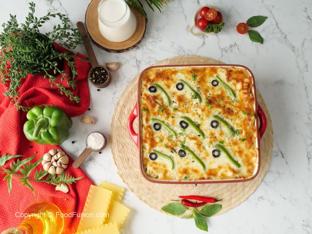 -Place lasagna sheets,add prepared chicken filling,olive oil,prepared creamy white sauce,fresh parsley,cheddar cheese,mozzarella cheese,lasagna sheets,prepared chicken filling,olive oil,prepared creamy white sauce,fresh parsley,cheddar cheese,mozzarella cheese,lasagna sheets,prepared chicken filling,olive oil,creamy white sauce,fresh parsley,cheddar cheese,mozzarella cheese, capsicum,black olives & sprinkle dried oregano.