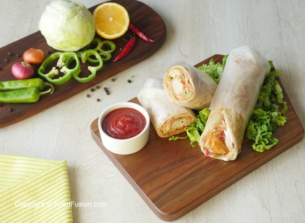 Paratha per tomato ketchup,stir fried vegetables,fried chicken nuggets aur tayyar cream & cheese sauce dal dein aur butter paper mein wrap ker ka serve karein!
