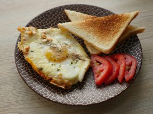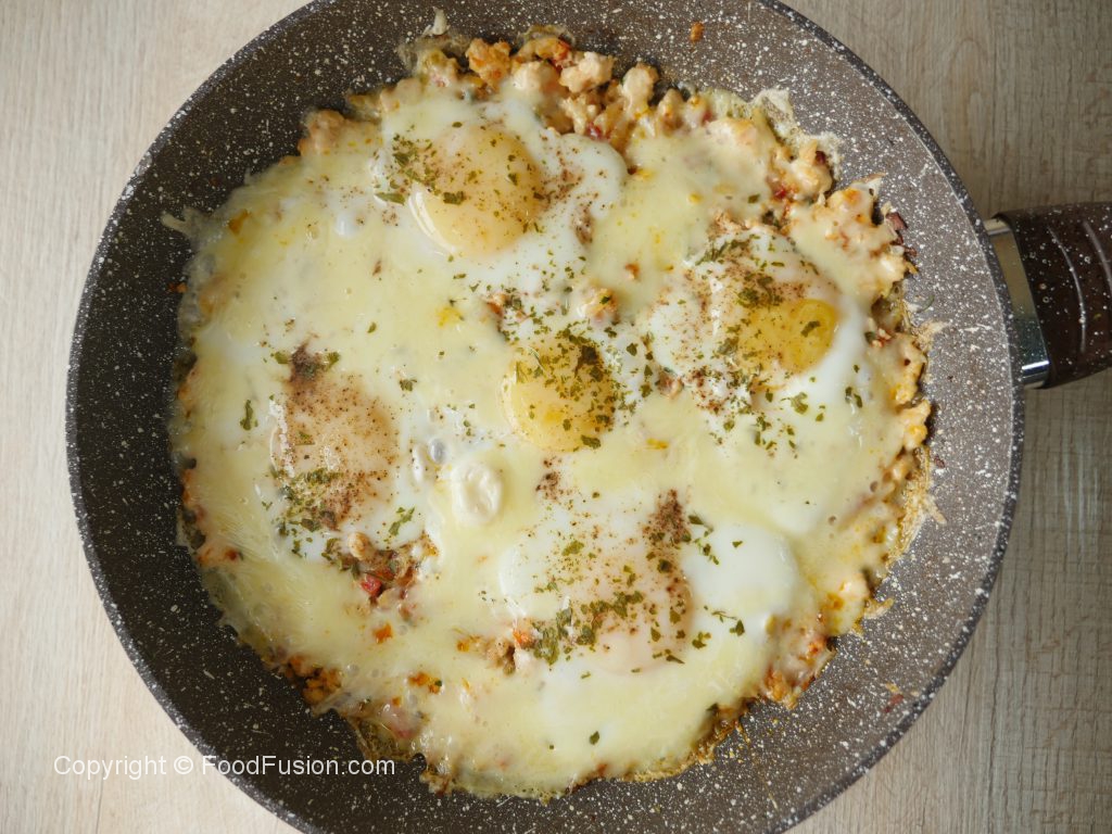 Pakay hoye mixture ko evenly pheela lein aur holes bana lein phir ek,ek ker ka anday shamil karein aur namak,kali mirch powder aur dried parsley chirak dein aur halki ancch per 2 minutes kliya paka lein.