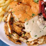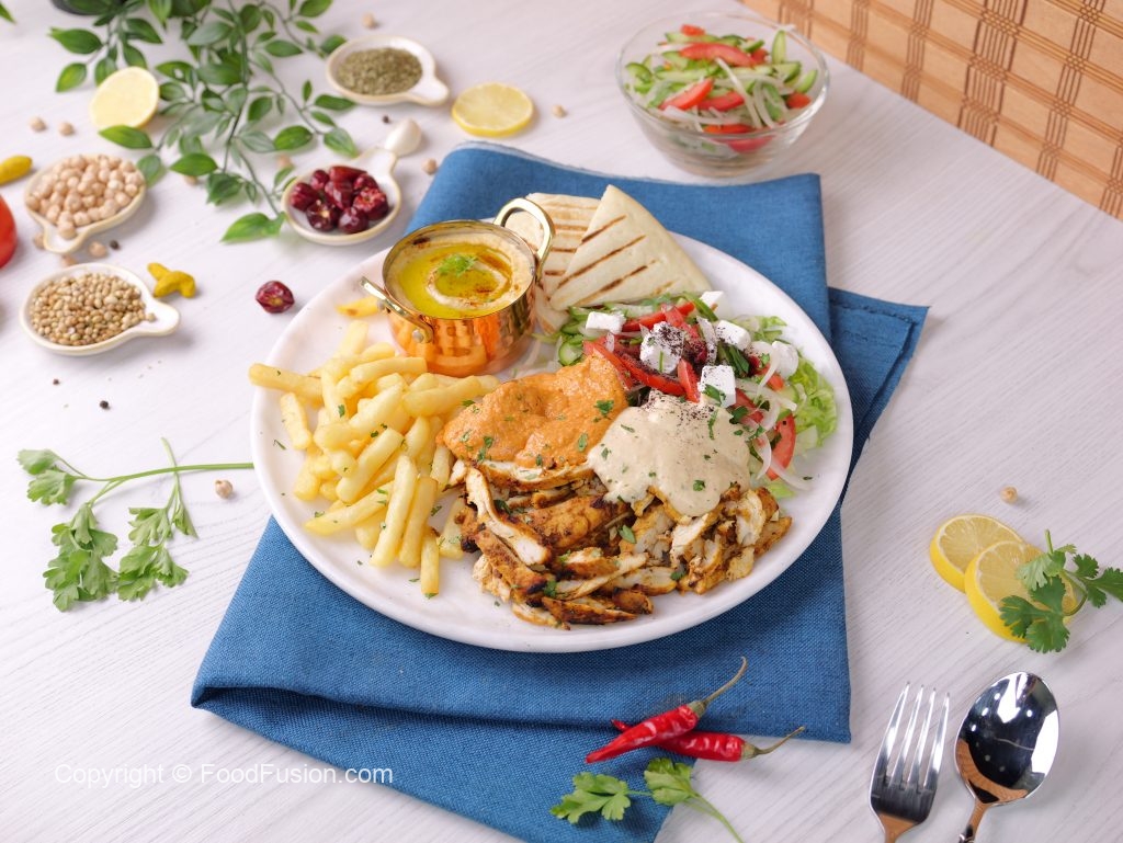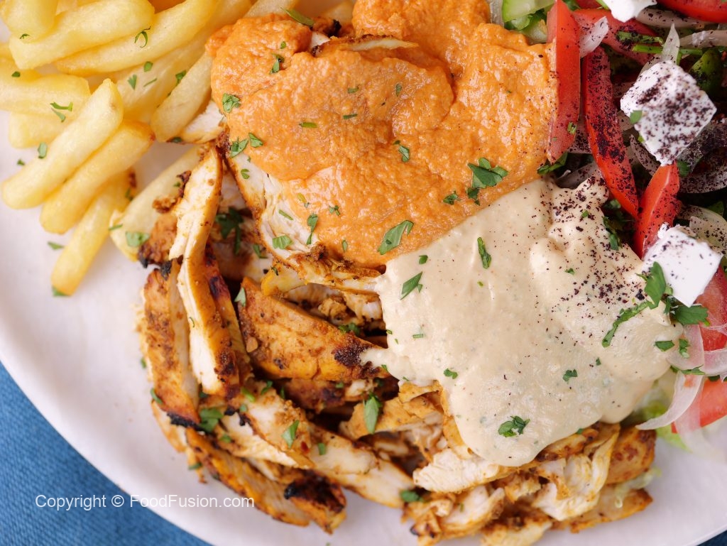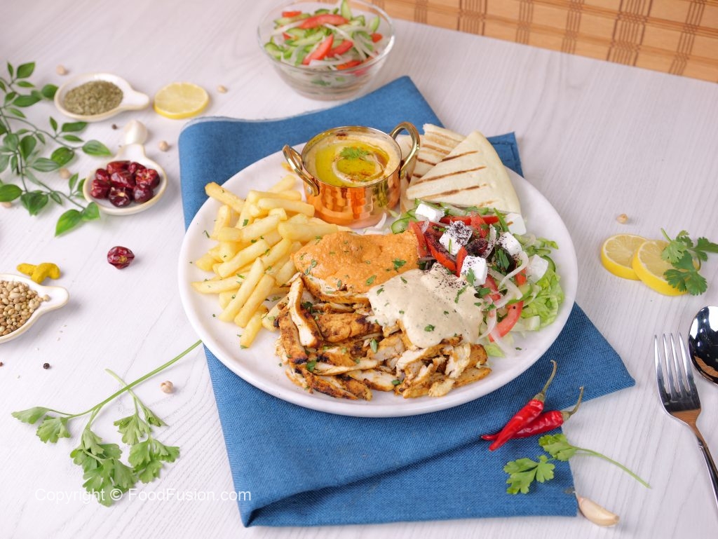 -On serving plate,add hummus,iceberg lettuce,salad,poatao fries,shawarma chicken slices,feta cheese,white sauce,red sauce,lemon juice,sumac powder,fresh parsley,pita bread & serve!