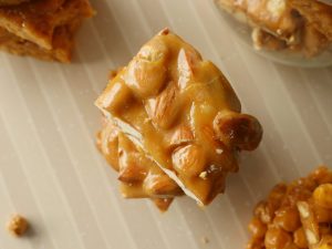 Grease working surface or tray with oil then transfer peanut mixture to the grease surface,shape to a rectangular and roll the mixture with the help of rolling pin evenly.