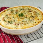 -Baking dish mein tayyar mince mixture,mac & cheese,mince mixture,mac 7 cheese,mince mixture, cheddar cheese,mozzarella cheese & fresh parsley dal dein.
