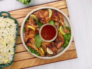 -Serve chicken tikka with egg fried rice.