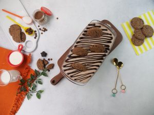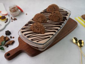 -Add a layer of soaked choco lava biscuits & chocolate custard cream.