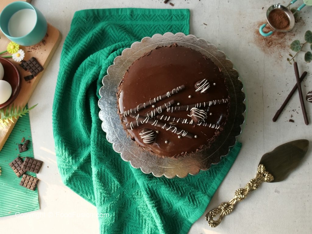 -Reserved warm chocolate ganache ko cake ka upper dal dein,cake ki sides per grated chocolate laga lein aur 30 minutes kliya refrigerate ker lein.