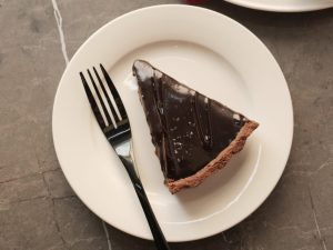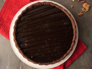 Pour prepared chocolate ganache over walnut salted caramel sauce,spread evenly & let it set in refrigerate for 2 hours.