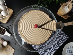 Add & spread coffee syrup and coffee butter frosting & frost the outside of the cake with coffee butter frosting.