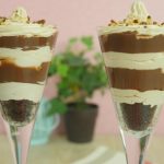 In serving glass,add crumbled brownie,coffee whipping cream,crushed coffee candy,prepared chocolate custard,coffee whipping cream and crushed coffee candy.