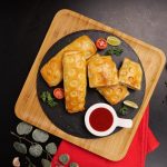 -Add 2 tbs of prepared chicken filling on rolled dough & roll it till half.