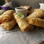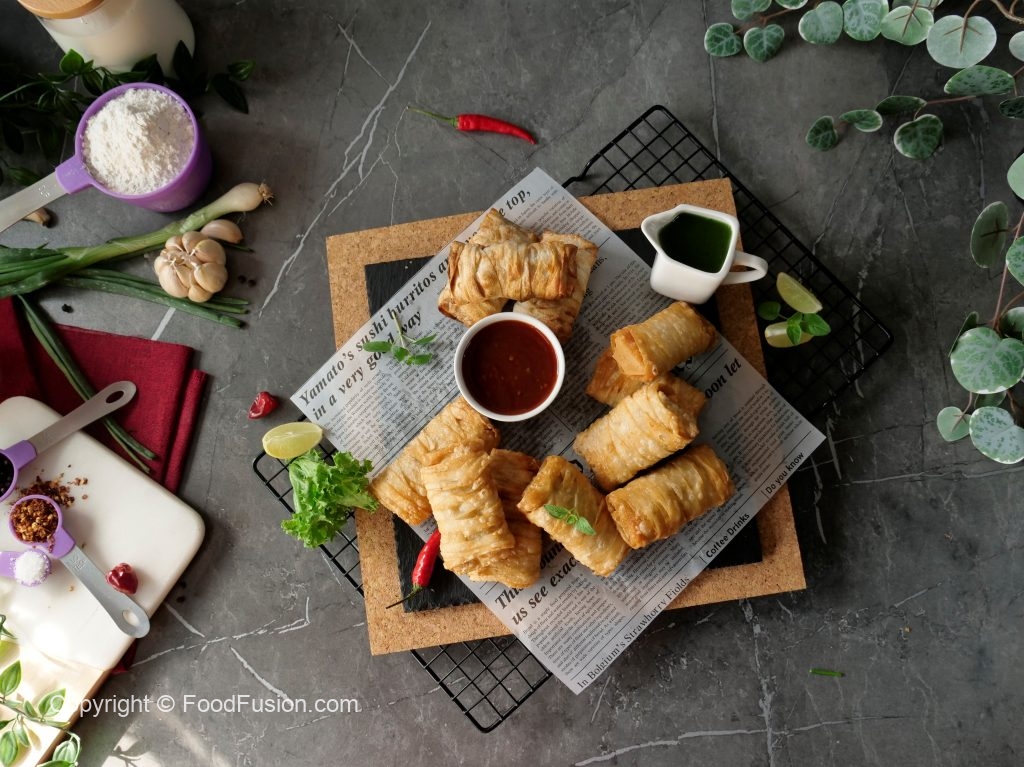 Add prepared creamy chicken filling and apply flour slurry then fold the sides and roll sheet to make samosa (makes 18-20).